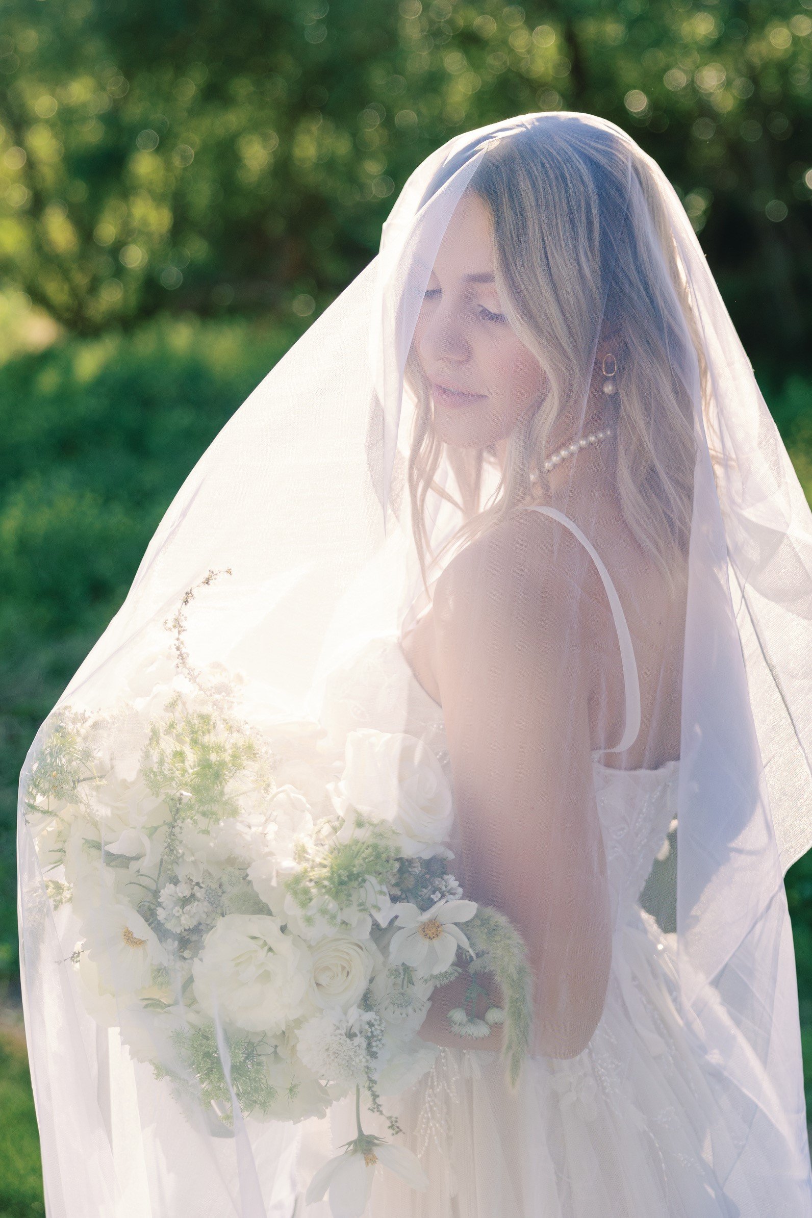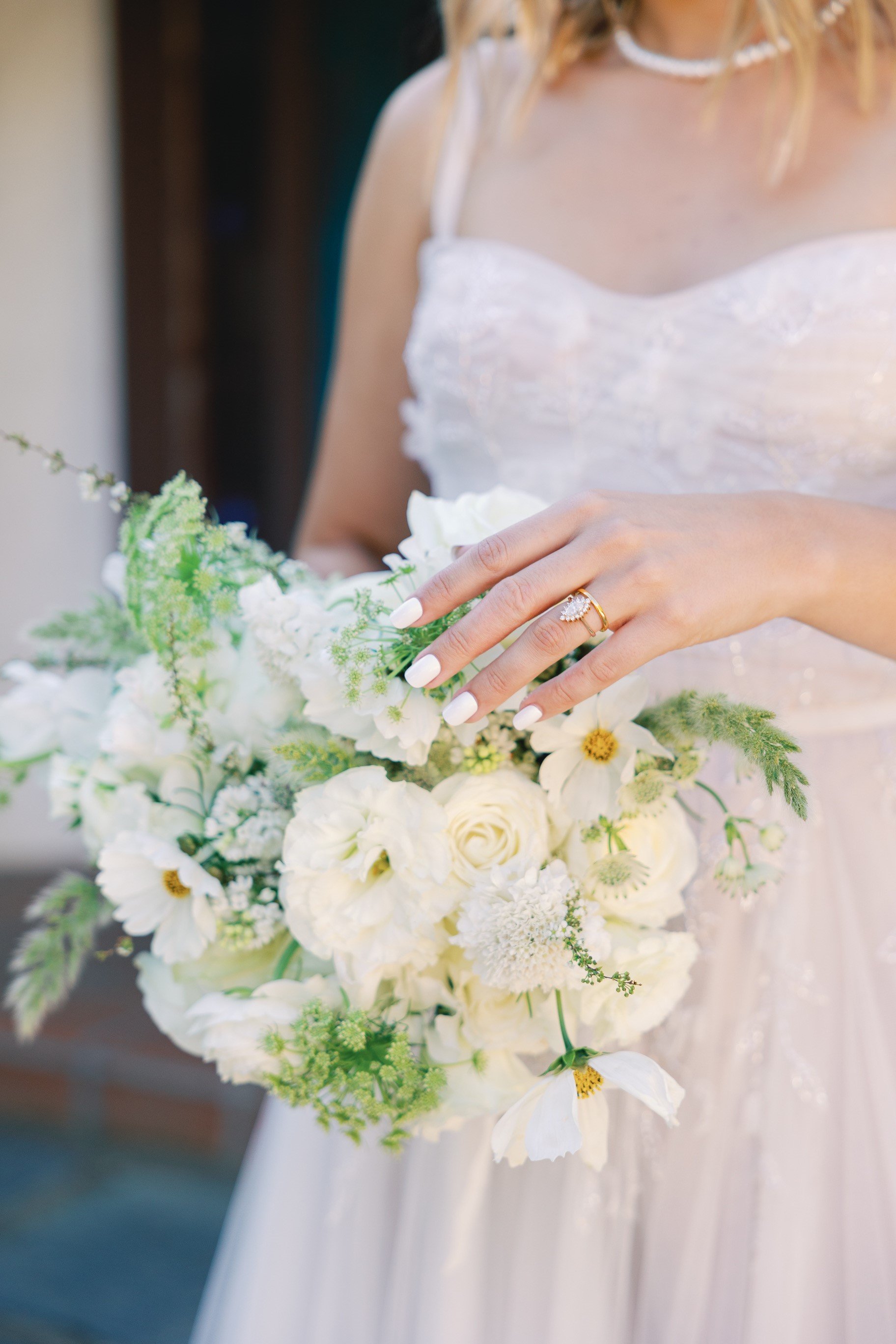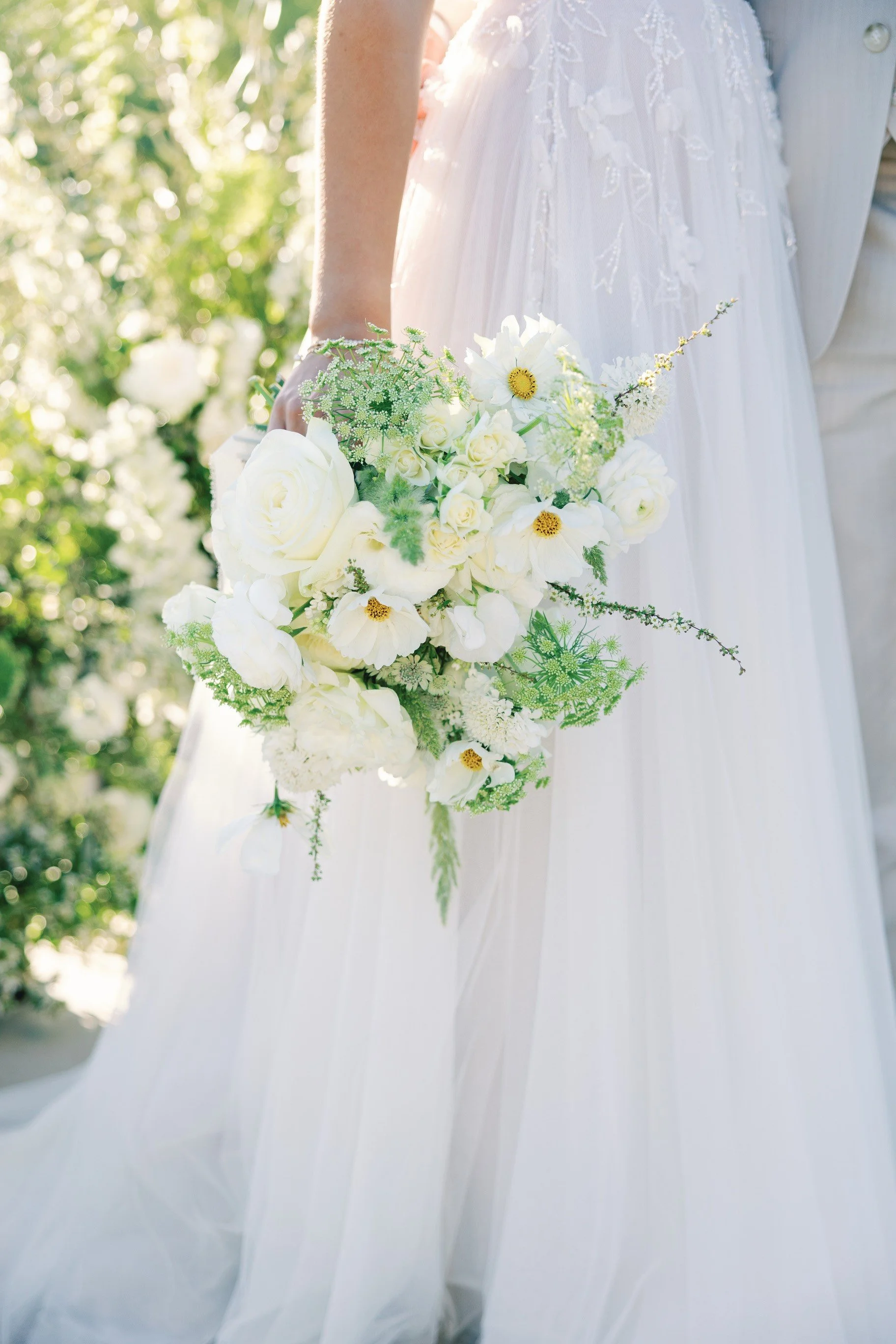 The bride carried a bridal bouquet that perfectly balanced untamed charm with structured grace. Wildflowers, garden roses, and delicate white cosmos created a composition that felt effortless yet artfully curated. This bouquet is ideal for brides dreaming of a natural wedding aesthetic with a touch of elegance.