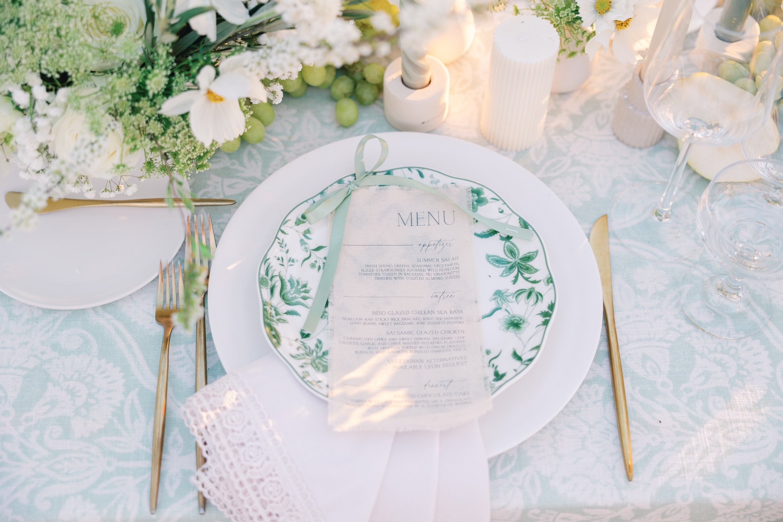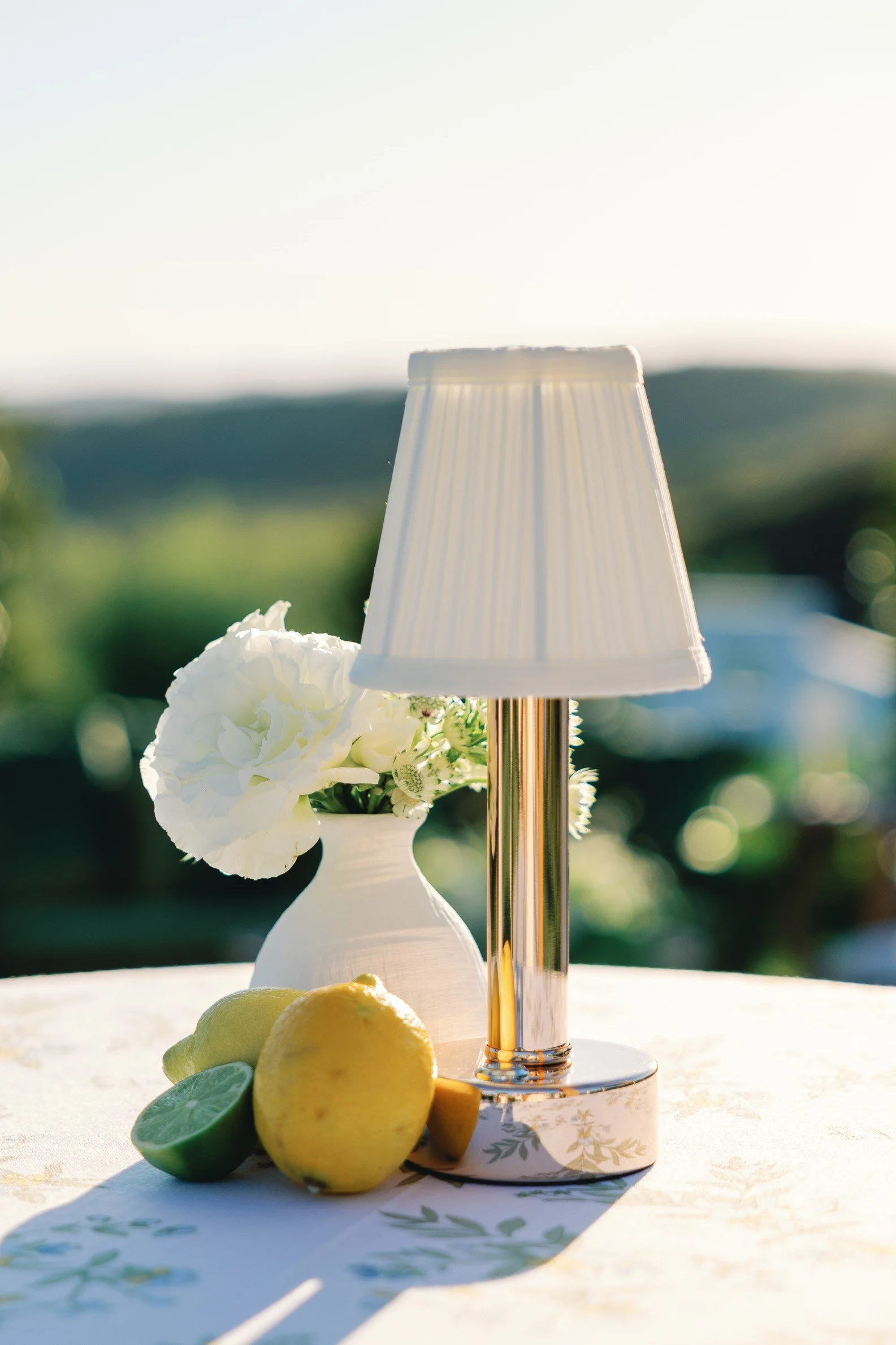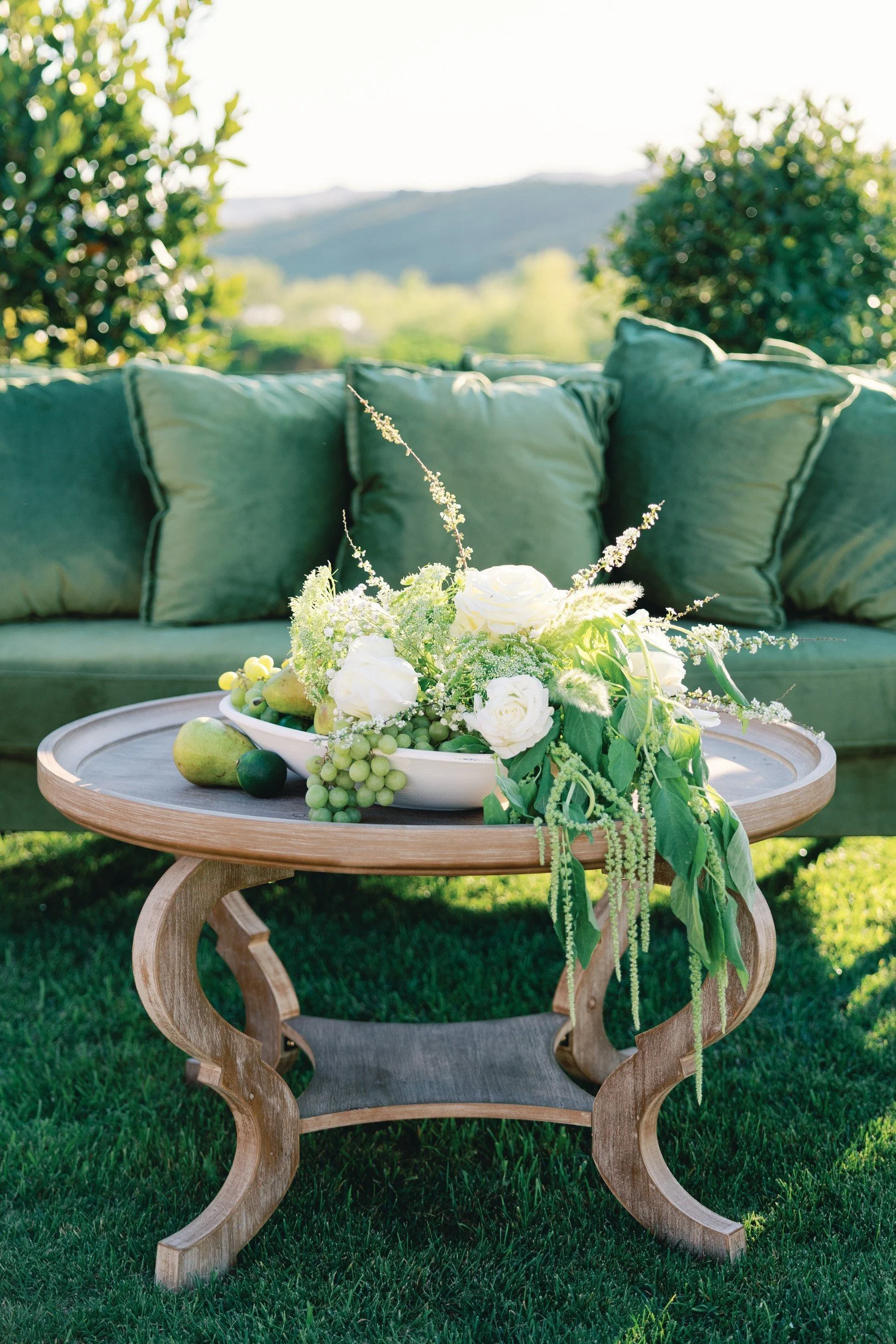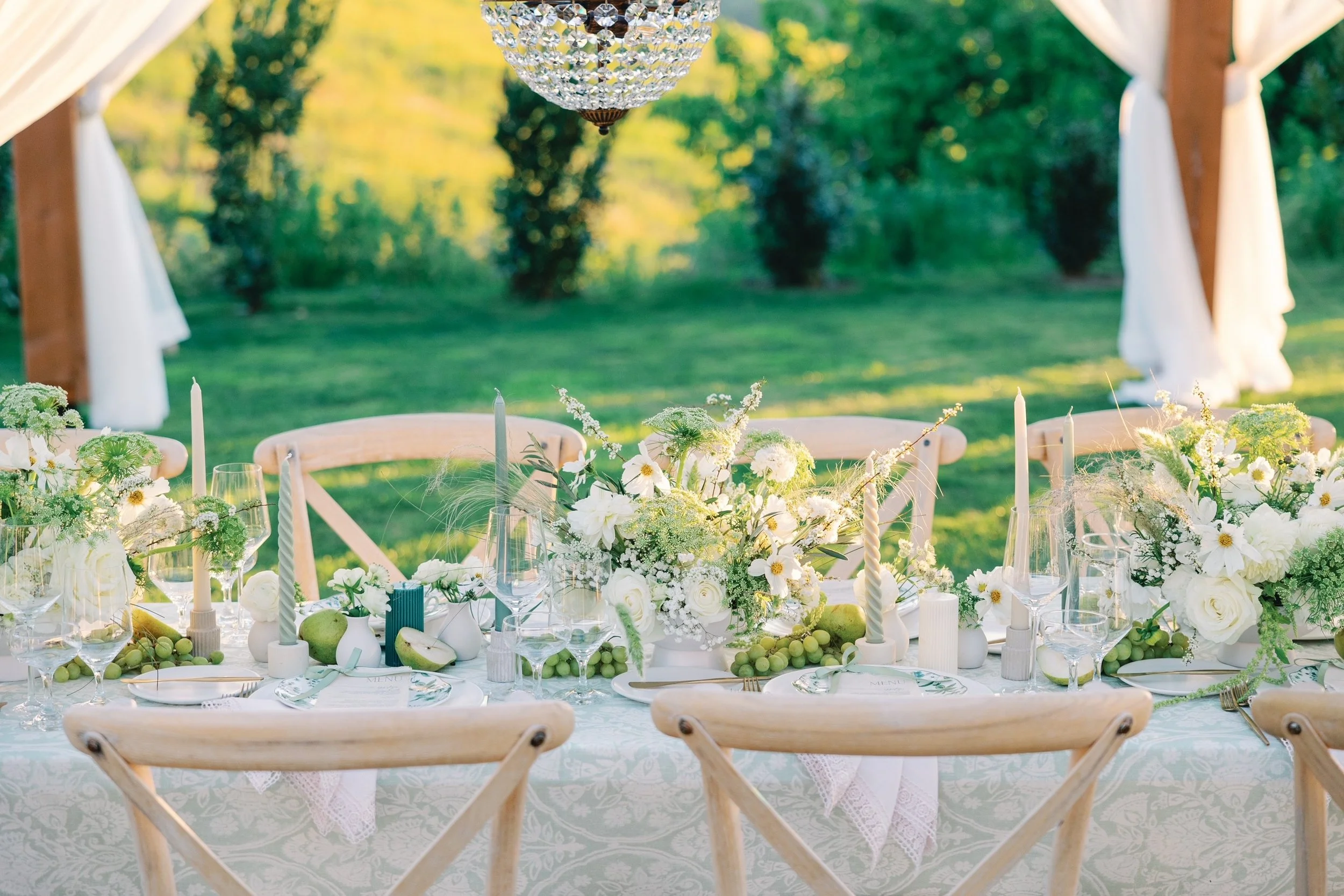 The wedding reception tables were a feast for the eyes. Graphic tablecloths provided a modern contrast to the rustic charm of white wildflowers and artfully placed fruit. This combination of textures and tones created a tablescape design that was both stylish and deeply connected to nature—perfect for couples who love modern-meets-rustic wedding décor.