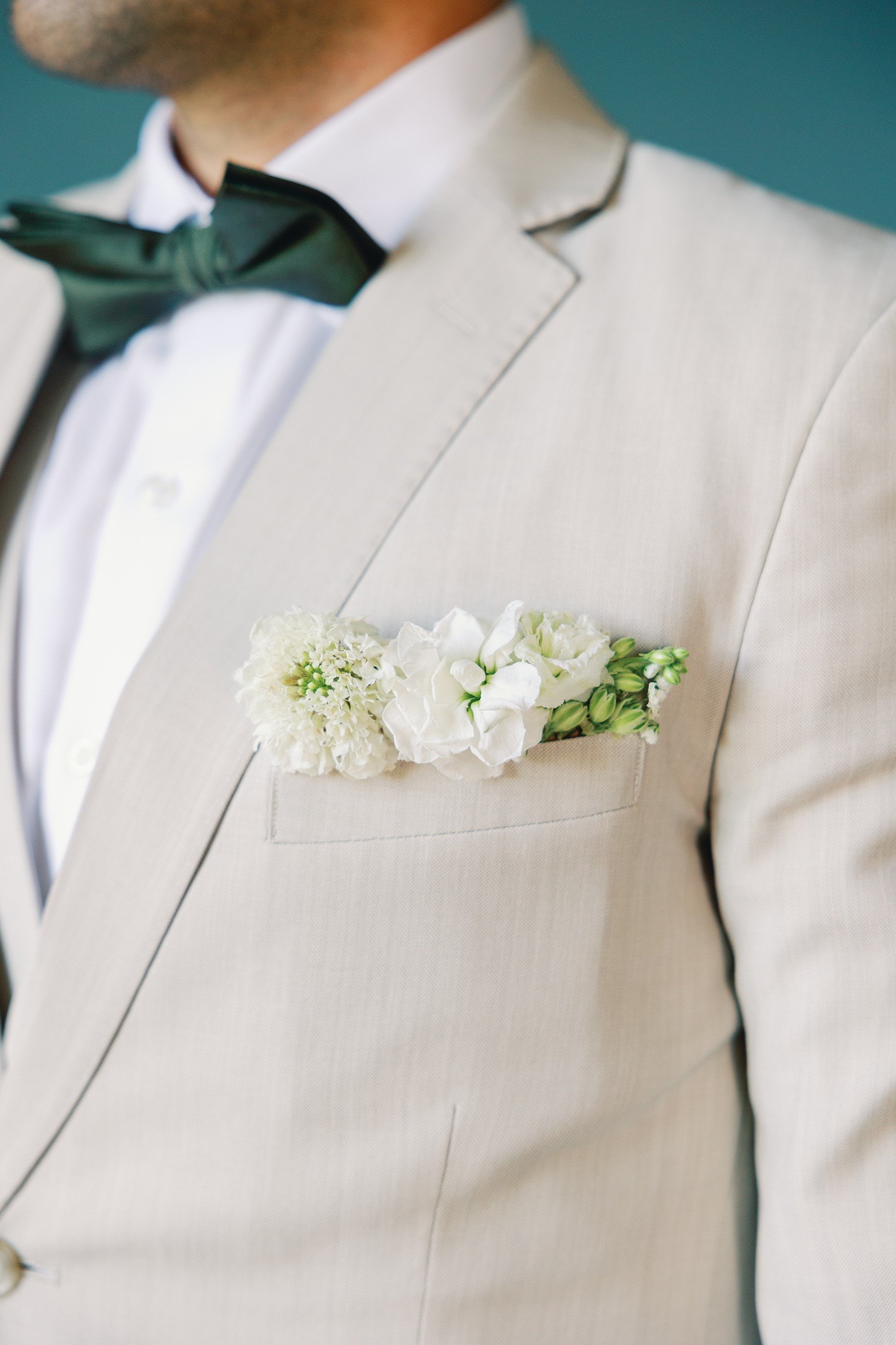 Put your best foot forward on your wedding day with the addition of a floral pocket square. It's simple and sophisticated, making it ideal for daytime events like the bridal brunch or rehearsal dinner.